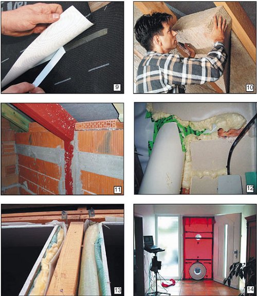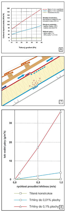 Vyobrazení 1. Zateplení mezi a pod krokvemi 2. Množství vlhkosti pronikající netěstnostmi v parozábraně 3. Řesení zateplení v úrovni kleštin 4. Rozdělení tepelných ztrát v rod. domku se zateplením 5. Rozdělení tepelných ztrát v rod. domku bez zateplení 6. Tepelné ztráty spárovou netěsností 7. Profoukavání tep. izolace spoji poj. hydroizolace 8. Množství vlhkosti vznikající spárovou netěsností v závislosti na rychlosti proudění vzduchu 9. Lepení spojů v přesahu pojistné hydroizolace 10. Vkládání tepelné izolace mezi krokve 11. Zabudovaný tepelný most - ocelový rám 12. Sanitarní prostup - chybějící parozábrana a tepelná izolace 13. Nedostatečná tep. izolace kolem rámu stř. okna 14. Ukázka testovacího zařízení