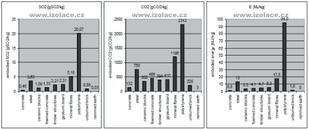 2.1 Environmentální kvalita stavebních materiálů a konstrukcí Environmentální kvalita stavebních materiálů zahrnuje kromě primárních požadavků na ekologickou a zdravotní nezávadnost také kvalitu z hlediska snížení energetických nároků spojených s materiálem či konstrukcí po celou dobu jejich životnosti. Tento ukazatel je zahrnut v tzv. „svázaných“ parametrech stavebních konstrukcích (embodied parameters), z nichž jsou pro environmentální hodnocení nejčastěji používány především: svázané emise CO2 [gCO2/kg] jako faktor globální environmentální zátěže, svázané emise SO2 [gSO2/kg] jako regionální environmentální zátěž, svázaná energie E [MJ/kg] jako přímé energetické nároky spojené s výrobou materiálů, celková hmotnost konstrukcí [t] zahrnující sekundárně náročnost dopravy. Hodnoty svázaných parametrů pro běžné typy stavebních materiálů jsou uvedeny v následujícím grafu a jsou převzaty z mezinárodně uznávaného zdroje [3].