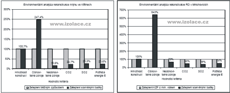 Graf. 2 - environmentální hodnocení zateplení s využitím slaměných balíků ve srovnání s běžnými způsoby řešení zateplení. Referenční hodnota pro „běžené“ způsoby zateplení reprezentuje 100% úroveň, ke které jsou vztaženy hodnoty zateplení s využitím slaměných balíků. 5. ZávěrPrezentované příklady využití alternativních materiálů pro tepelné a akustické izolace staveb jsou v současnosti v rovině experimentálních technologií, což se ve srovnání s běžnými postupy projevuje zvýšenou pracností, malou rychlostí výstavby i velkými nároky na pracovní sílu. Pro širší využití je potřeba dořešit technické a technologické souvislosti, zefektivnit výrobu a provádění, zajistit neměnnou technickou kvalitu materiálů apod. Současně je nutné ověřit vlastnosti materiálu v dalších souvislostech, při extrémním namáhání zejména vlhkostní, ověřit hygienickou nezávadnost atd. Při stávajících vlastnostech běžně užívaných tepelných izolací (minerální vlákna, polystyreny, polyuretany…) jsou i tyto materiály ve specifickém prostředí (individuální výstavba, zemědělské či horské oblasti…) schopny konkurovat a přispět ke snížení vlivu stavebnictví na životní prostředí. V globálním kontextu pak mohou efektivní technologie využívající tyto přírodní obnovitelné zdroje surovin patřit k významným technologickým alternativám a napomoci zefektivnění a zkvalitnění výstavby v rozvojovém světě při omezení zvýšení vlivu stavební produkce na environment. Tento výsledek byl získán za finančního přispění MŠMT, projekt 1M6840770001, v rámci činnosti výzkumného centra CIDEAS. Literatura[1] AGENDA 21 pro udržitelnou výstavbu, český překlad CIB Report 237, ČVUT v Praze, Praha, ISBN 80-01-02467-92, 2001 |