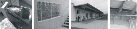 Obr. 5-8 - detail skladby obvodové stěny s tep. izolací ze slámy (vlevo). Rekonstrukce školy a přístavba tělocvičny, Allentsteig, Rakousko (vlevo uprostřed). Foto A. Brotánek. Novostavba pasivní mateřské školy, Ziersdorf, SRN s tepelnou izolací ze slámy a s hliněnými omítkami (vpravo uprostřed). Foto M. Vonka. Detail zateplení střechy RD slaměnými balíky, Říčany, ČR. 3.2.2 Využití technického konopí Jednou z mnoha aplikací technického konopí je průmyslová výroba tepelné izolace, která zahrnuje tvrzené desky pro akustické izolace podlah, stabilizované desky pro KZP a měkké rohože. Výrobky mají deklarovánu řadu stavebně fyzikálních vlastností [6], kromě základních (objemová hmotnost 24–42 kg/m3, součinitel tepelné vodivosti 0,040 W/(m.K), faktor difúzního odporu 1–2), také požární odolnost B2 podle DIN 4102-1, rozměrovou stálost, test odolnosti proti plísním, činitel zvukové pohltivosti αw = 1,00 při tloušťce 160 mm (podle DIN EN ISO 354), nasákavost ≤ 4,2 kg/m2, atd.