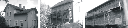 Obr. 13-15 - rekonstruovaný objekt původního mlýnu ve Křtinech (vlevo), zateplení stávající stěny (uprostřed), zateplení stropu slaměnými balíky a hliněnou mazaninou (vpravo). Foto A. Brotánek. 4.2 Rodinný dům v Mnichovicích Jedná se o zděný dvoupodlažní podsklepený objekt. Předmětem rekonstrukce bylo zaizolování severní fasády, které je provedeno tep. izolací ze slaměných balíků tloušťky 350 mm v dřevěném roštu zaklopeném heraklitem s omítkou rabitzovém pletivu. Konstrukce je shora kryta přesahem střechy, okraje, pata stěny a sokl jsou zatepleny extrudovaným polystyrenem tl. 200 mm na vyrovnávací omítce, ochrannou vrstvu pod úrovní UT tvoří nopová fólie. Jako konstrukční alternativa pro environmentální posouzení je navržen KZP z min. vláken tl. 320 mm v dřevěném roštu. Úprava u přesahu střechy, okrajů a paty stěny a soklu je shodná. Součinitel prostupu tepla je U = 0,11 W/(m2.K).