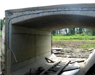 Jednalo se o úplnou přestavbu dvoukolejného železničního mostu na trati Hranice – Vsetín. Přestavba byla zaměřena na minimalizaci výluk za použití předem vybetonovaných železobetonových konstrukcí a jejich následnému příčnému zásunu do otvoru. Součástí řešení je rovněž řešení styku podélné pracovní spáry mezi oběma konstrukcemi. Územní podmínky Most je situován na dvoukolejné železniční trati Hranice na Moravě - Vsetín, v definičním úseku Černotín – Špičky. Železniční trať se v tomto mezistaničním úseku vine údolím řeky Bečvy. Řeka je vzdálena od mostu cca 100m jižním směrem. Most převádí koleje č.1 a č.2 přes občasnou svodnou linii. Železniční těleso je vedeno v náspu. Vzhledem k tomu že se jedná o záplavové území, slouží most při záplavách také k vyrovnávání hladin vody na obou stranách železničního náspu (nedojde k protržení násypového tělesa). Vzhledem k tomu, že trať je v tomto úseku vysoce frekventovaná byli výluky provozu sníženy na minimum. Původní stav Nosnou konstrukci mostu tvoří ŽB-deska se zabetonovanou tuhou výztuží. Tuhou výztuž zde v tomto případě pravděpodobně tvoří válcované I-nosníky. Mostovka má délku 3820mm a šířku 8500mm. Mostovka je uložena na ŽB-úložných prazích. Spodní stavba je masivní tížná. Tvoří ji dvě betonové opěry. Na opěry navazují svahová křídla. Opěry mají tloušťku 1,450m, délku 6,900m a max. výšku 3,000. Beton opěr i křídel je staticky narušen a lokálně porostlý mechem. U dna jsou opěry i křídla silně porušena vymíláním. V konstrukci jsou masivní trhliny. Spodní stavba je narušována jak přívalovou a stojatou (při zvýšené hladině řeky Bečvy) vodou, tak i vodou protékající skrz neizolované základy stavby. Z těchto důvodů byl most navržen na celkovou přestavbu. Celková koncepce opravy mostu Vzhledem k velkému zatížení železniční trati v tomto úseku byly omezeny výluky v jednotlivých kolejích na minimum. Rozměry mostu umožnily příčný zásun předem vybetonovaných rámů bez pomoci speciálních přípravků. Z tohoto důvodu bylo od počátku opravy mostu přistoupeno tak, že nejprve byly vybudovány po obou stranách kolejí železobetonové tubusy (uzavřený rám) včetně celoplošné izolace na rubu konstrukce. Tuto přípravu bylo možné provést za plného provozu na železniční trati. Před zásunem byl provoz převeden na kolej č. 1 a provedena demolice nosné konstrukce mostu. Původní opěry zde zůstaly a byly pouze ubourány cca o 300 mm tak, aby zde bylo možné zasunout novou nosnou konstrukci. Po zásunu tubusu do otvoru byly provedeny přechodové oblasti a vybudován železniční svršek v koleji č. 2. Stejně tak bylo postupováno při zásunu nosné konstrukce pod kolej č. 1. Celková doba nutná pro demolici , zásun a zprovoznění jedné koleje činila 5 dnů. Při tomto postupu byly využity stávající opěry jako ztracené bednění a nebylo tedy nutné otevírat tak velkou stavební jámu pro jejich demolici. Do otvoru tak byla zasunuta kompletní nosná konstrukce mostu bez nutnosti dalších úprav. Řešení spáry na styku monolitických rámů mostu Neméně důležitou částí této mostní konstrukce byl detail spáry v místě styku obou monolitických železobetonových rámů. I když se v principu jedná o pracovní spáru, bylo k návrhu i realizaci přistoupeno tak, jako by se jednalo o spáru dilatační. To vyžadovalo, aby výplň spáry byla schopna přenášet veškeré pohyby, které by mohly způsobit účinky vyvozené např. dotvarováním konstrukce, povětrnostními podmínkami nebo zatížením od dopravy. Důležitým požadavkem na výplň spáry byla schopnost trvalého utěsnění tohoto detailu takovým materiálem, který bude schopen odolávat i mínusovým teplotám. Vzhledem k tomu, že vodotěsná izolace byla u objektu řešena standardním způsobem, tj. asfaltovými pásy s tvrdou ochranou izolace na mostovce, bylo potřeba vyřešit, jak těsnost spáry po celém jejím obvodu zajistit. Jelikož se mělo provést pouze částečné odbourání stávajících opěr, zbylo by po zasunutí rámů na jejich místo mezi původní a novou konstrukcí prostor o šířce cca 100 mm. To v zásadě znemožňovalo provedení napojení vodotěsné izolace v místě spáry na rubu objektu. Řešení dodatečného utěsnění styčné spáry bylo zadáno společnosti Minova Bohemia s.r.o., která navrhla systém sendvičové výplně. Tato výplň byla vyvinuta pro sanace netěsných dilatačních spár konstrukcí pozemního stavitelství a dopravních staveb. Utěsňující sendvičová výplň sestává ze tří částí: 1. uzavírací tmel spáry na vnitřním líci konstrukce – trvale pružný tmel CarboLan, 2. pomocná (montážní) výplň spáry – těsnicí provazec z pěnového polyetylénu, 3. utěsňující výplň spáry – injekční metakrylátový gel CarboCryl Wv Plus. Bylo potřeba „pouze“ vyřešit, jak sendvičovou výplň aplikovat. Její hlavní součástí je metakrylátový gel CarboCryl Wv Plus, který se aplikuje injektáží. U sanovaných dilatačních spár se gel injektuje přes pakry osazené do vývrtů v betonové konstrukci. U nově budované konstrukce však tento způsob nebyl přijatelný. Proto se pro zaplnění spáry použila technologie, která je známá z výstavby monolitických betonových konstrukcí podzemních částí budov (např. podzemních garáží). Jedná se o tzv. injekční hadice, které se osazují do pracovních spár konstrukce ve fázi její výstavby a používají se jako pojistný systém v případě průsaků. Jejich velkou výhodou je, že umožňují pozdější utěsnění spáry bez nutnosti provádění vývrtů do konstrukce, přičemž délka injektovaného úseku může být až 15 m
